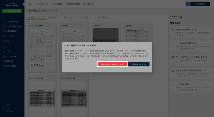 a) 「定型文書」と「非定型文書」の両方を同じジョブプロセス内でより簡単に仕分けでき るように、仕分け結果確認画面を大幅に刷新しました。詳細な説明と手順について は、弊社マニュアルをご参照ください。