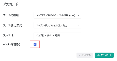 - 「ダウンロード」ダイアログの [ヘッダーを含める] チェックボックスにチェックを入れると、文書抽出ジョブ結果のエクスポート先である出力ファイルにフィールド名を含めることができます。