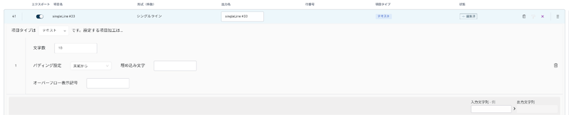 - [文字数制限] フィルターを使用することで、フィールドの出力文字数を制限できます。オプションとして、入力値が制限に満たない際に先頭または末尾から [埋め込み文字] でパディングしたり、入力値が制限を超過している際にオーバーフロー表示記号を表示して入力値を切り詰めたりできます。例えば、文字数制限を「3」に、末尾に対するパディングを「-」に、オーバーフロー表示記号を「+」に設定すると、入力値が空白である場合には「---」が出力され、入力値が「1234」である場合には「12+」が出力されます。