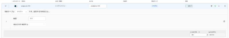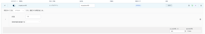 - [前置] および [後置] フィルターを使用すると、カスタム文字または別のフィールドの値をフィールド出力の先頭または末尾に追加できます。例えば、これらのフィルターを使用して [ジョブ作成日] 補足情報フィールドの値 (例: 20260303) を先頭に、「123」を末尾に追加した場合、入力値「abc」に対する出力値は「20260303abc123」となります。