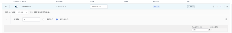 - [文字抽出] フィルターを使用すると、入力値の先頭または末尾の文字を任意の数だけ出力できます。例えば、[文字数] を「1」に設定し、[終わりから] にチェックを入れた場合、入力値「abc」に対する出力値は「c」になります。